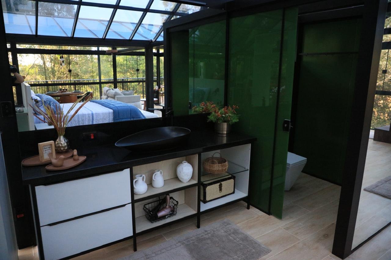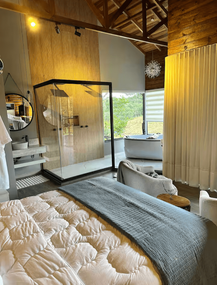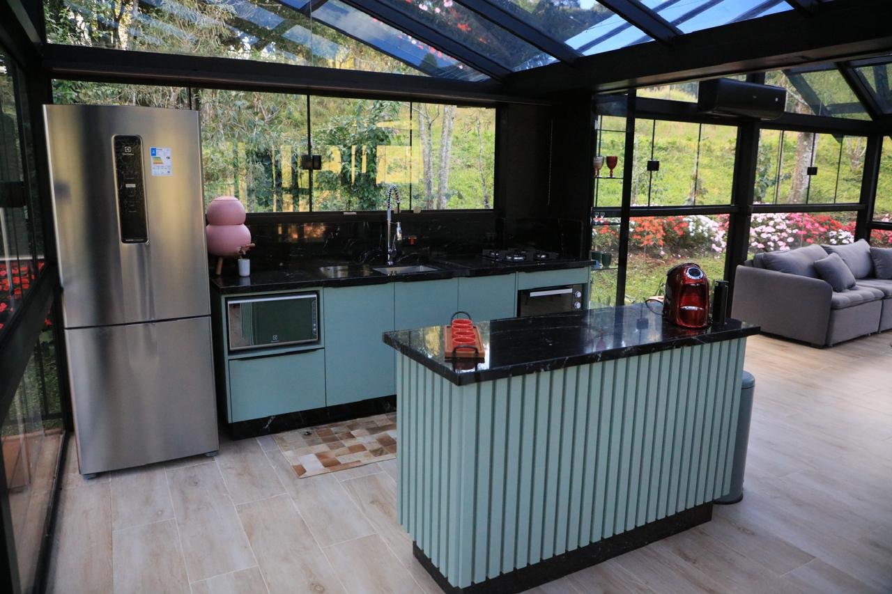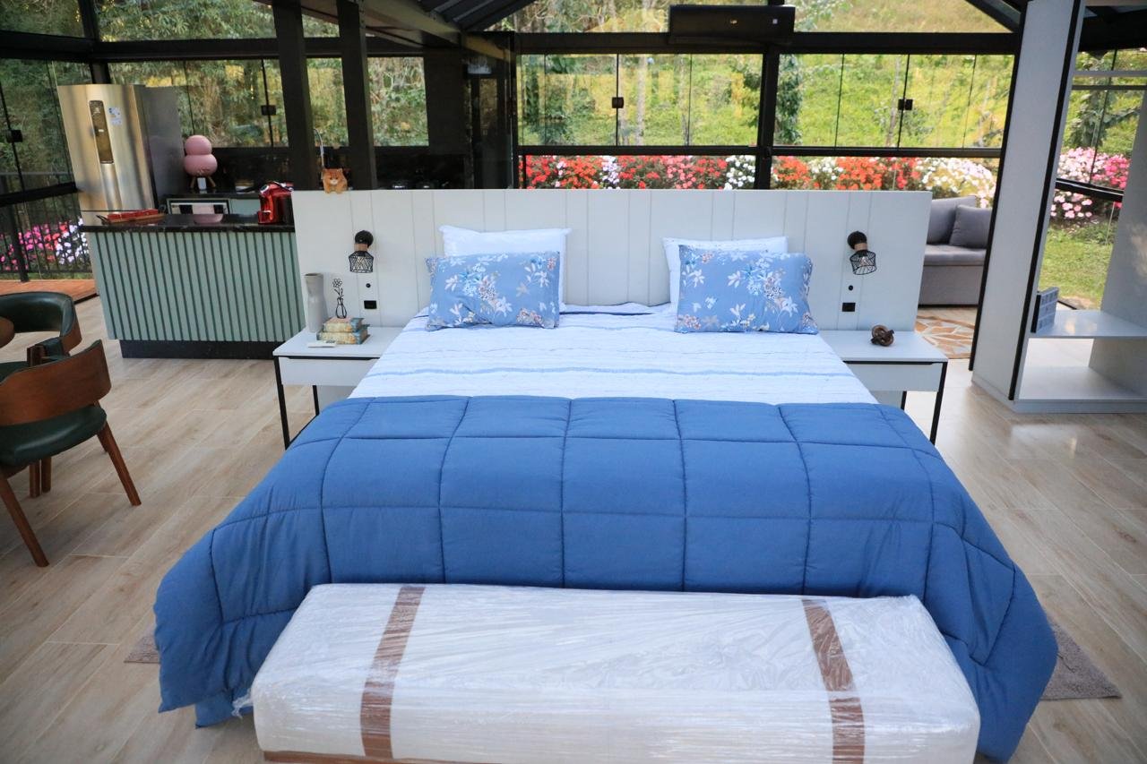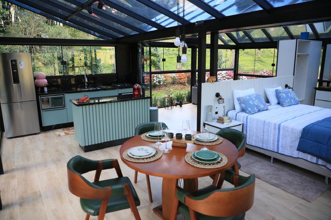Chalé de vidro com estrutura completa, vista para o verde e clima de casa de campo. Aqui, a liberdade de uma casa no campo se une ao conforto de um hotel sofisticado. Ideal para quem busca momentos de descanso em família, contato com a natureza e tranquilidade. Tudo isso em um ambiente integrado, acolhedor e instagramável.